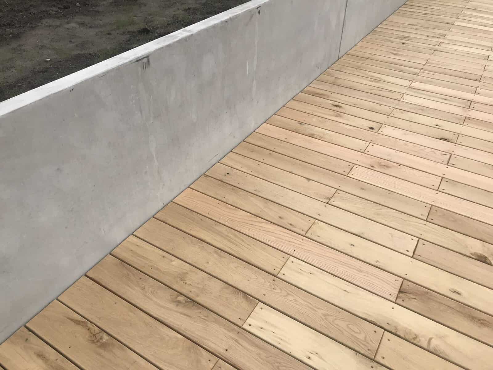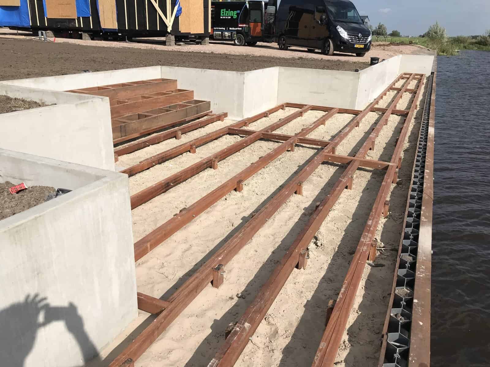 In Haren hebben we 120 meter kunststof walbeschoeiing geplaatst op een bedrijventerrein. Langs de waterkant hebben we ook 40 meter betonnen keerwand gezet, als afscheiding van de hardhouten vlonder met eikenhouten dekdelen. Die dekdelen hebben we in wildverband gelegd, dat oogt net wat speelser.