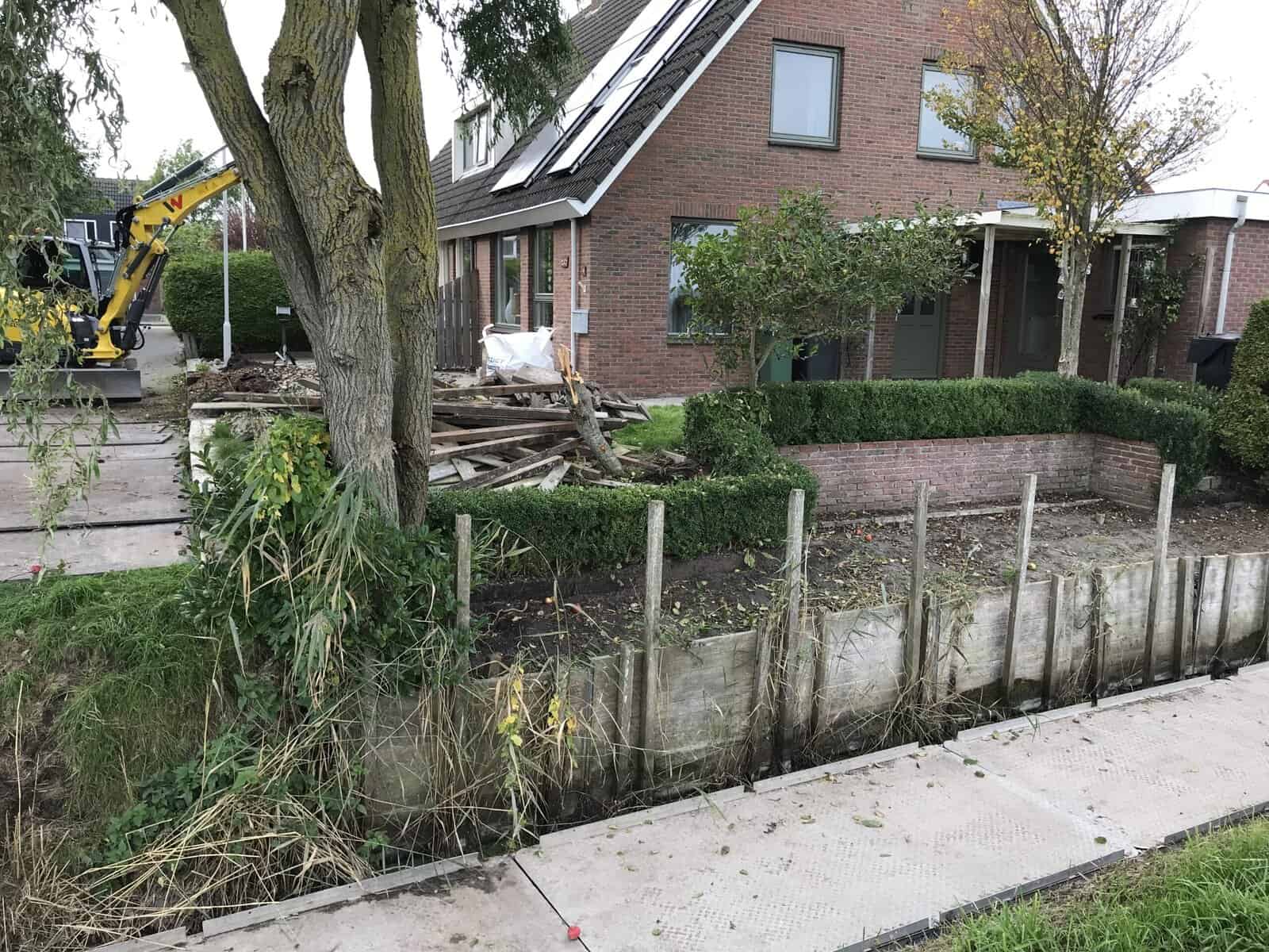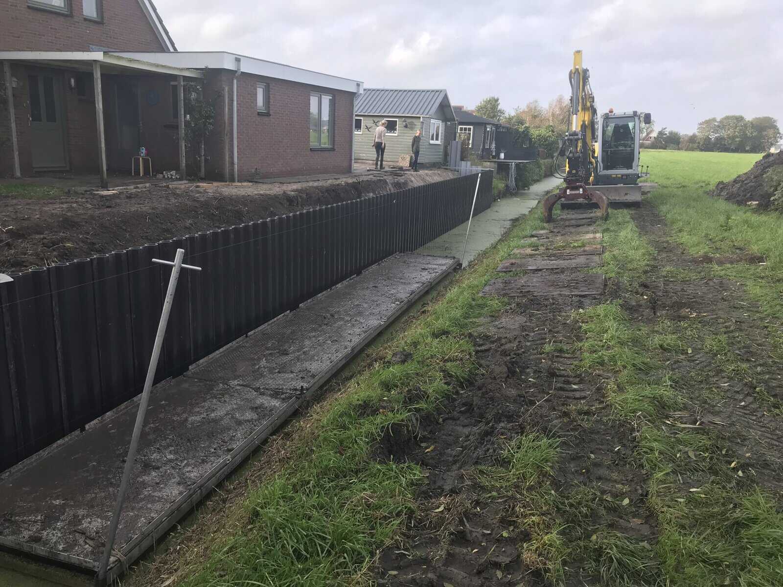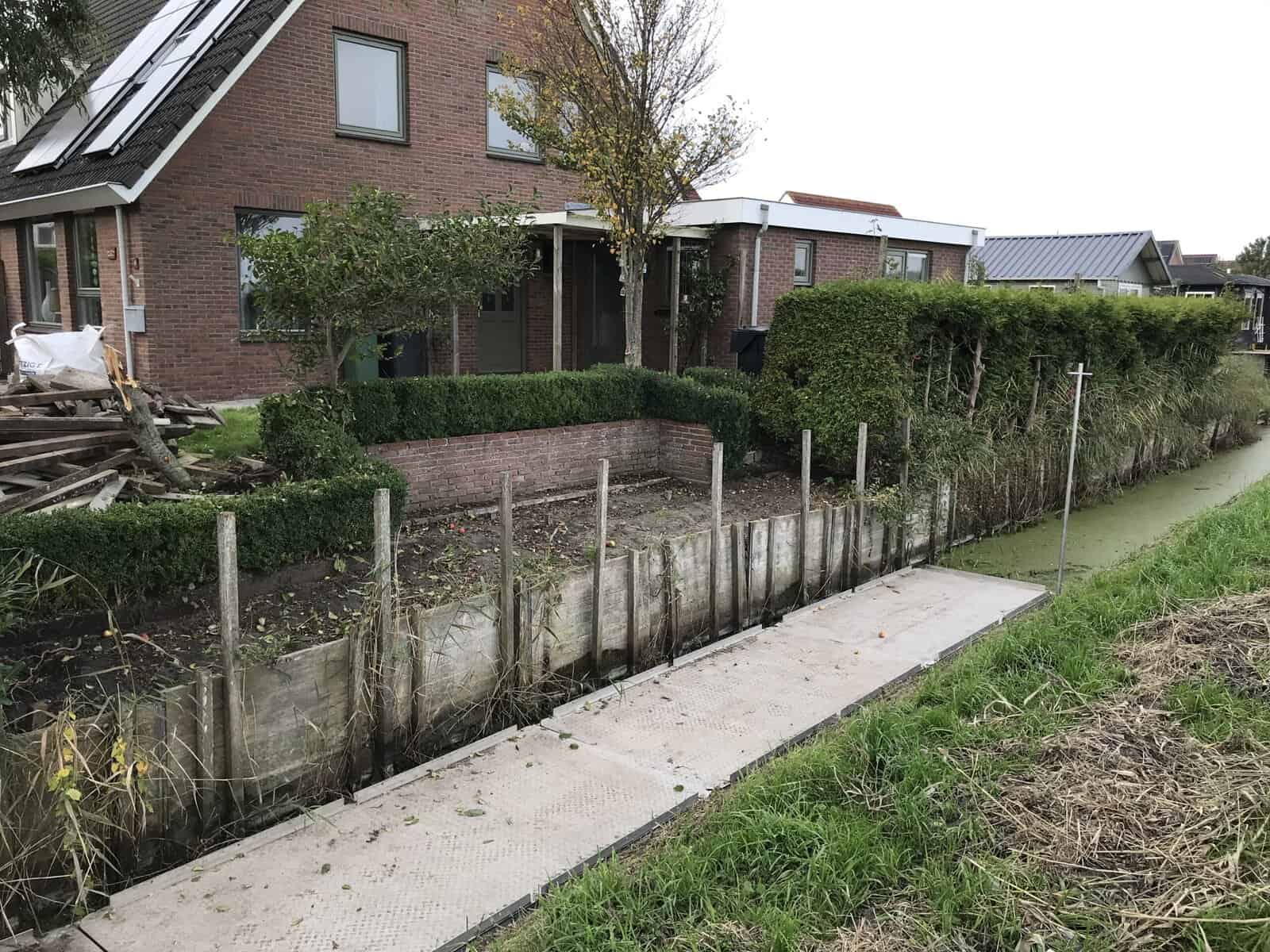 In Groningen hebben we een tuin groter gemaakt met kunststof walbeschoeiing. We konden mooi via het weiland van de buurman werken, dat scheelt gesleep door de tuin. Eerst hebben we het grondwerk gedaan en daarna meteen de nieuwe tuin aangelegd. Zo konden we alles in één keer netjes afronden.