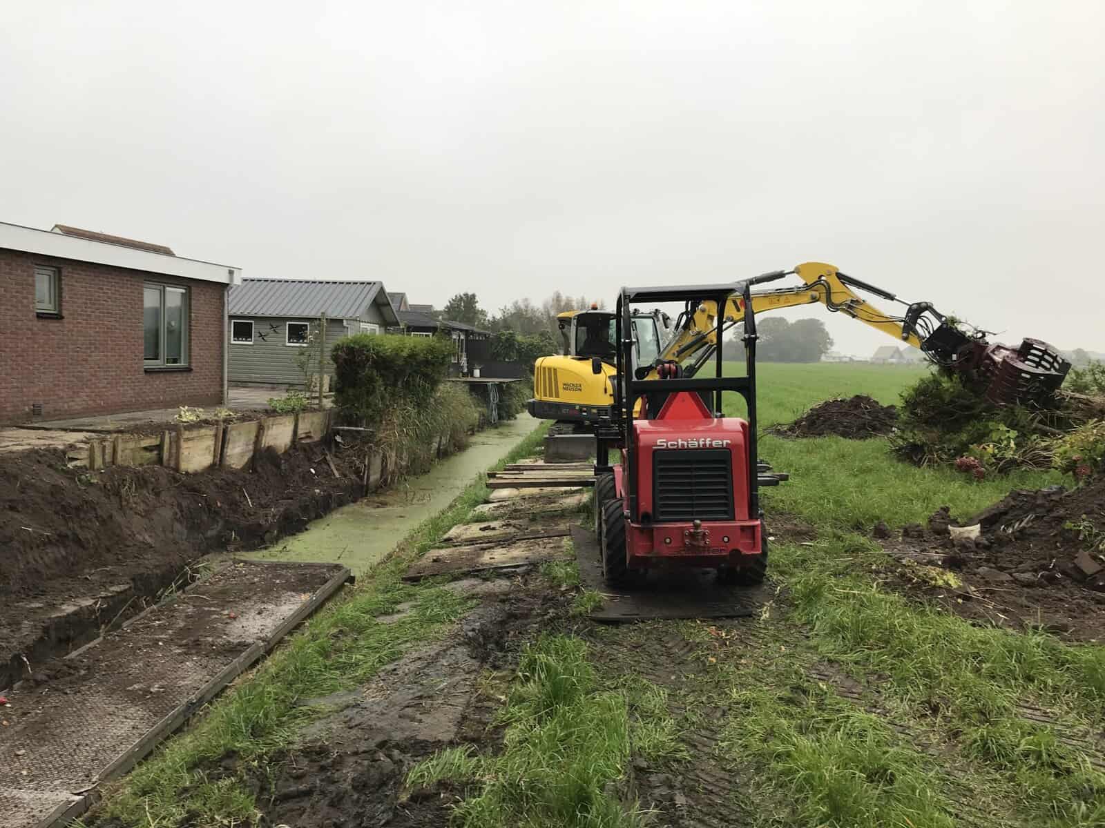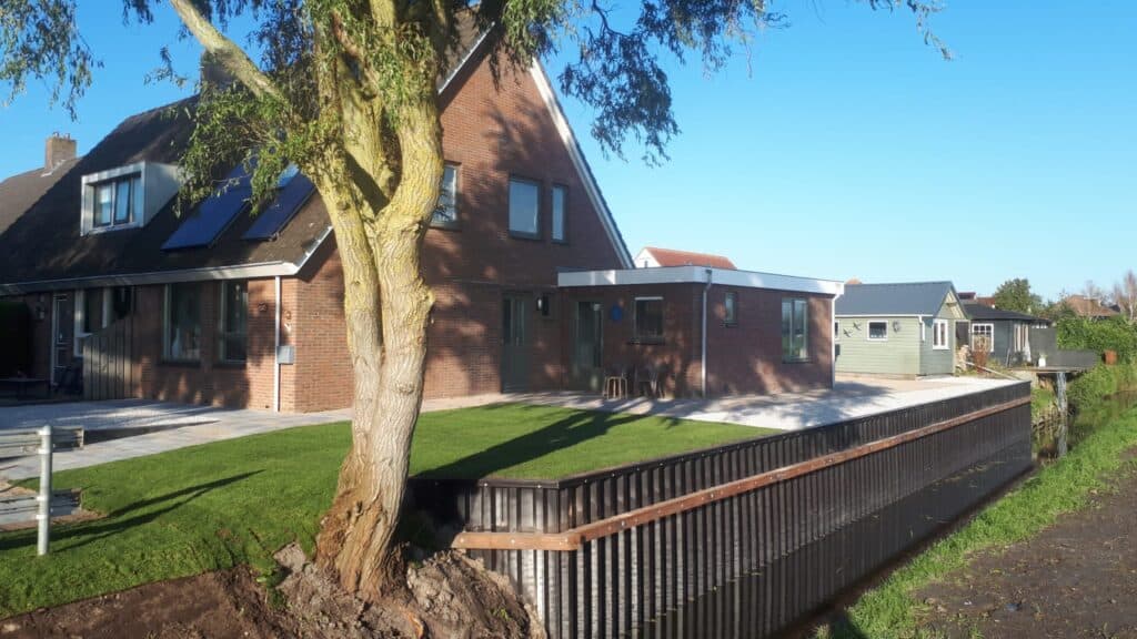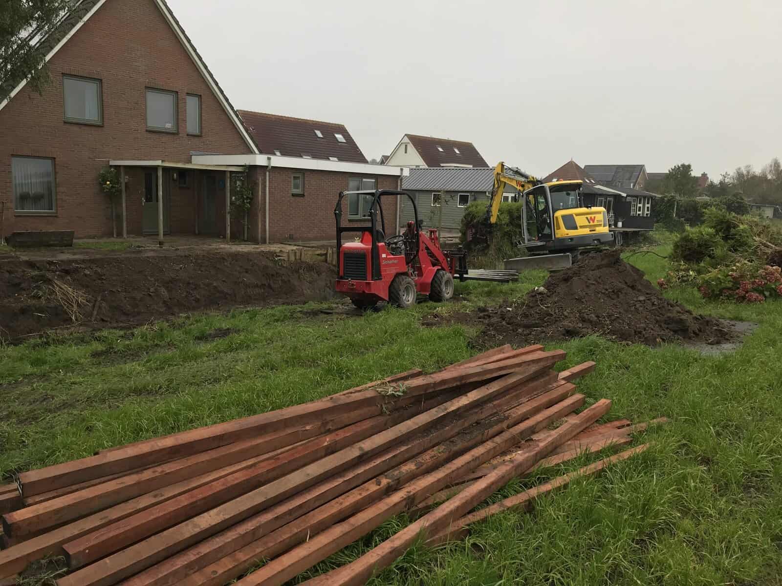 In Groningen hebben we een tuin groter gemaakt met kunststof walbeschoeiing. We konden mooi via het weiland van de buurman werken, dat scheelt gesleep door de tuin. Eerst hebben we het grondwerk gedaan en daarna meteen de nieuwe tuin aangelegd. Zo konden we alles in één keer netjes afronden.