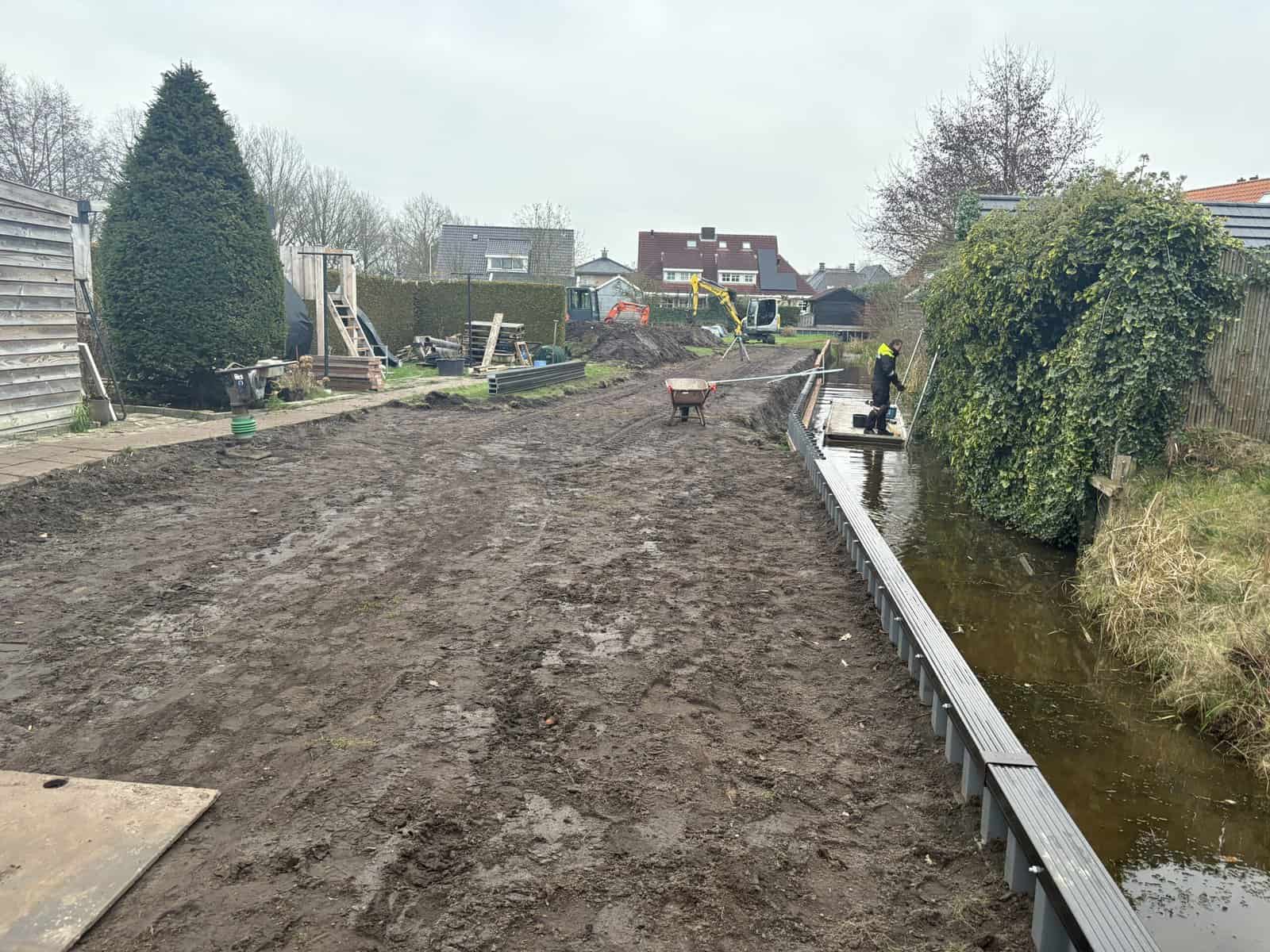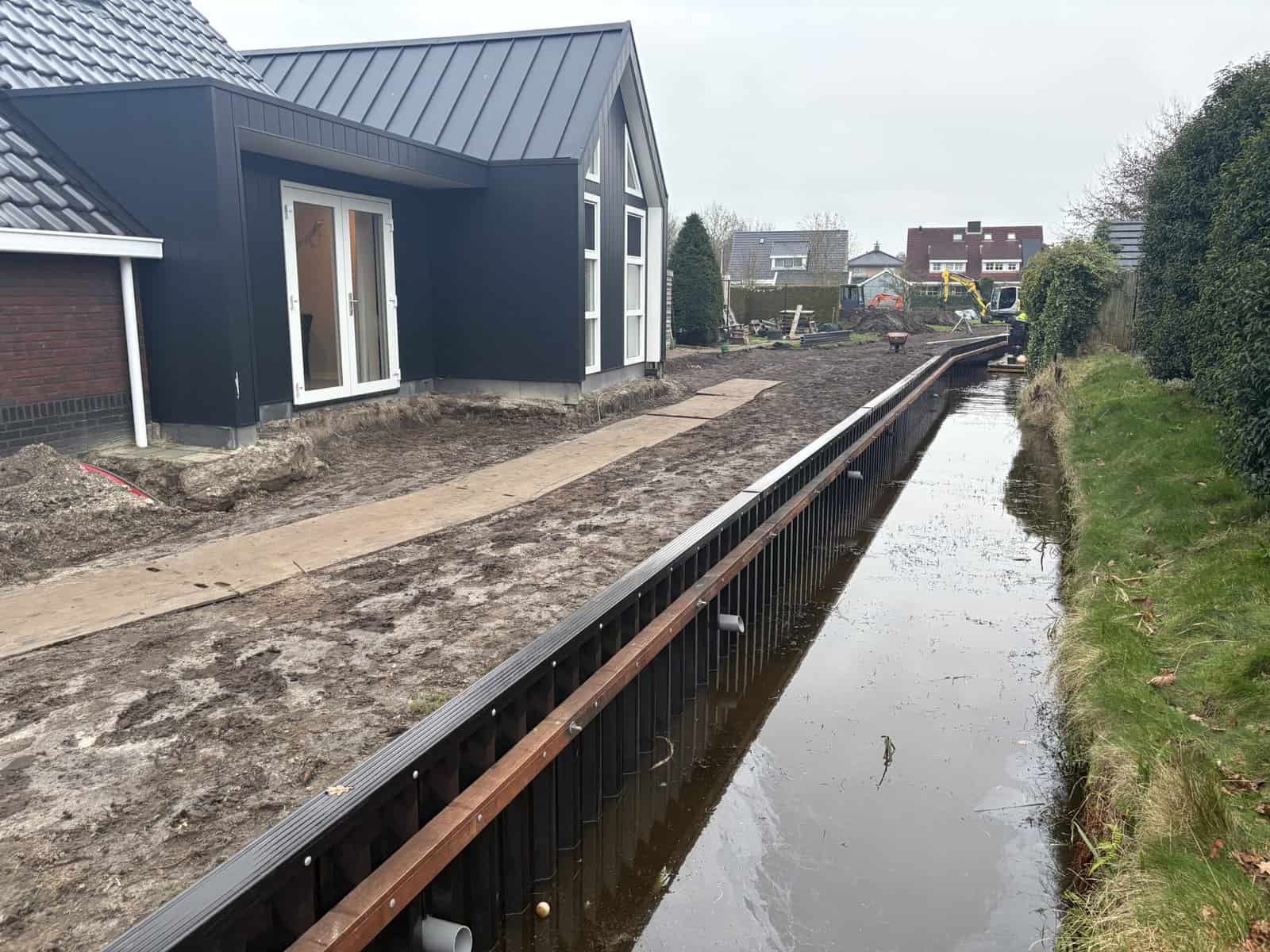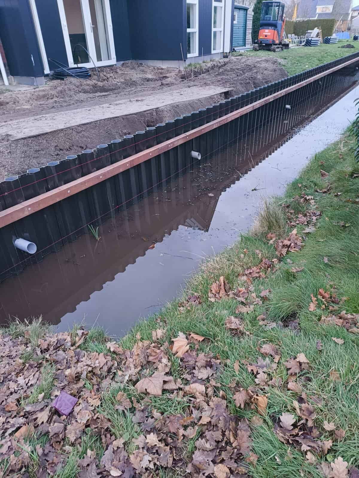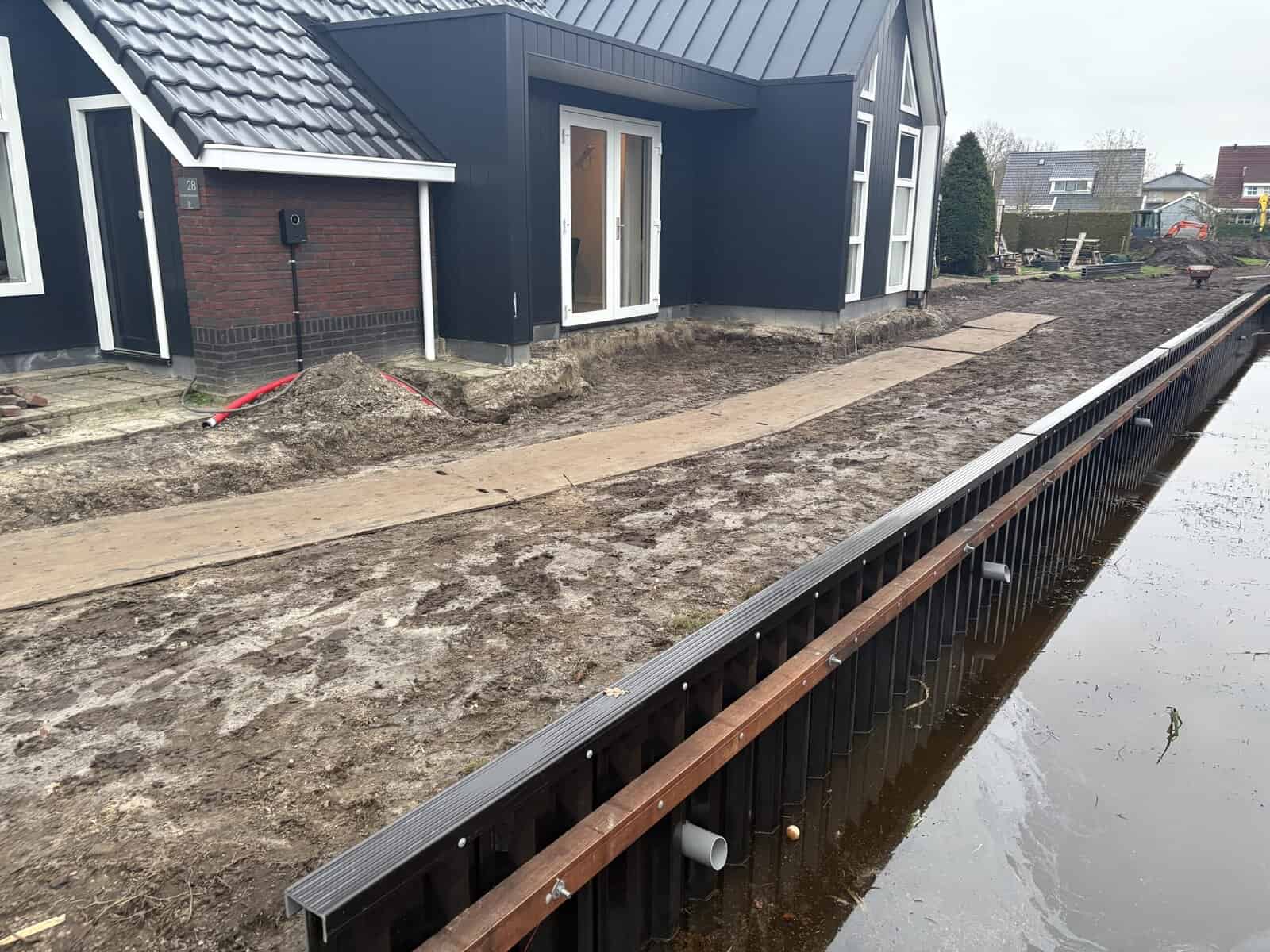 Strak grondwerk en functionele afwerking Na het slaan van de damwandschotten hebben we de beschoeiing voorzien van een robuuste deksloof van gerecycled kunststof. Deze sloof beschermt de bovenkant van de schotten en zorgt voor een strakke, egale afwerking. De grond achter de beschoeiing is aangevuld en geëgaliseerd, wat zorgt voor een bruikbaar en veilig terrein langs de waterkant. Met dit project in Surhuisterveen hebben we een duurzame en onderhoudsvriendelijke basis gecreëerd.