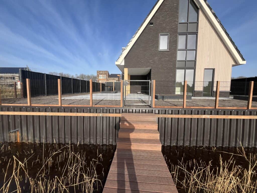Aan de rand van Eelderwolde staat deze moderne woning prachtig aan het water, en de nieuwe kunststof walbeschoeiing sluit daar naadloos op aan. Strak, duurzaam en met een hoogwaardige hardhouten afwerking die het geheel een luxe uitstraling geeft. De doordachte combinatie van kunststof en hout zorgt voor een oever die niet alleen mooi oogt maar ook jarenlang sterk blijft.