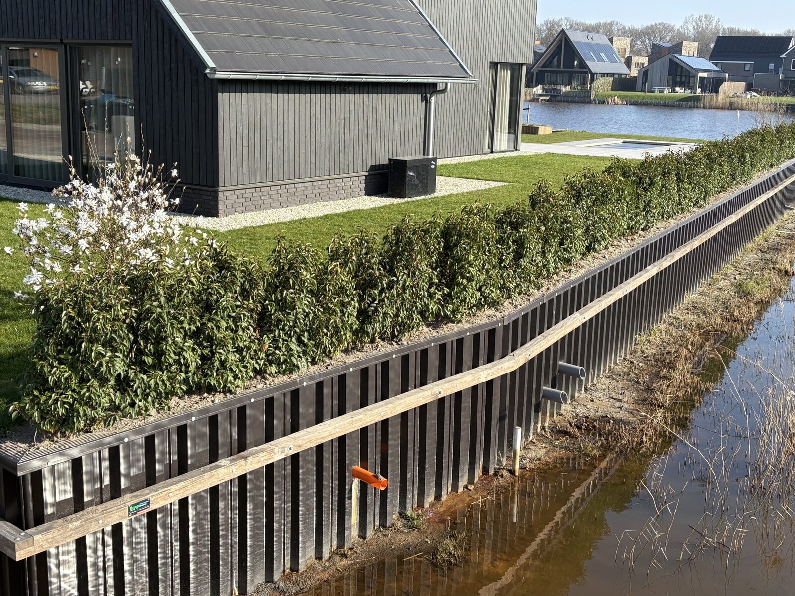 In Eelderwolde is deze strakke kunststof walbeschoeiing aangebracht, perfect passend bij de moderne woningen die hier aan het water zijn gebouwd. De combinatie van duurzame kunststofplanken en hardhout zorgt voor een sterke, onderhoudsarme oever die er jarenlang mooi uit blijft zien.