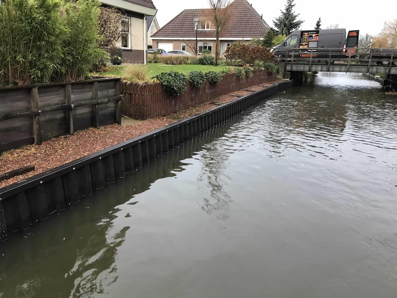 In Eelderwolde hebben we kunststof walbeschoeiing geplaatst, netjes vóór de oude beschoeiing. De bestaande beschoeiing was niet zo hoog, waardoor we hier geen ankers hoefden te gebruiken. Dat scheelt natuurlijk in de kosten en in werk. Deze kunststof walbeschoeiing in Eelderwolde is een handige oplossing als je waterkant nog prima staat, maar je wel onderhoudsvrij verder wilt.