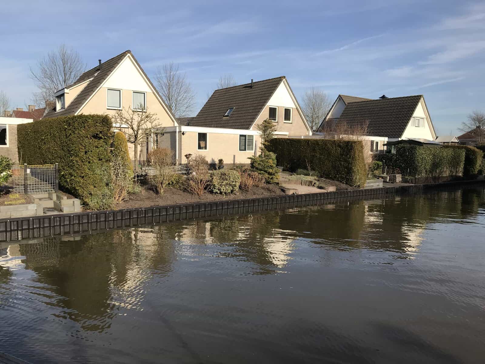 Hier is een compleet nieuw traject aangelegd waarbij de oude beschoeiing vervangen is door duurzame kunststof delen. Op de eerste foto is te zien hoe het werk in uitvoering is, met het plaatsen van de schotten en het gebruik van materieel vanaf het water. Op de tweede foto zie je het eindresultaat: een strakke, onderhoudsarme en toekomstbestendige walbeschoeiing die weer jarenlang meegaat en het water een nette uitstraling geeft.
