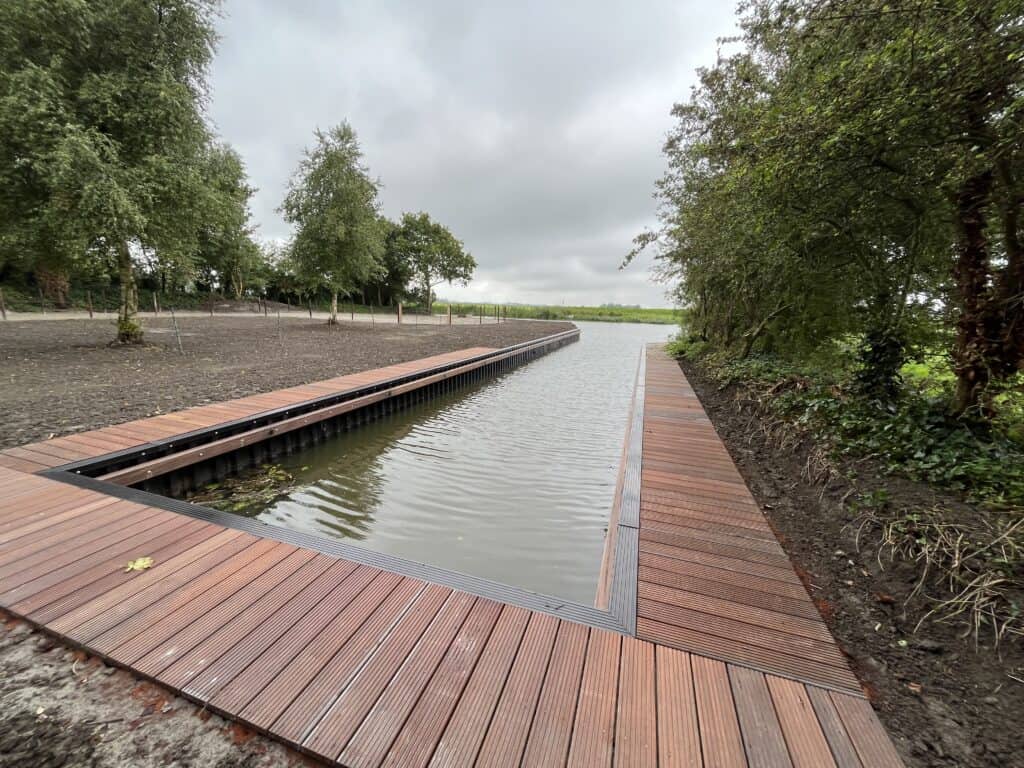 De strakke lijnen langs het water geven het terrein een nette en duurzame uitstraling. Tegelijkertijd voorkomt de beschoeiing afkalving en vormt het een solide basis voor de verdere inrichting van het perceel.