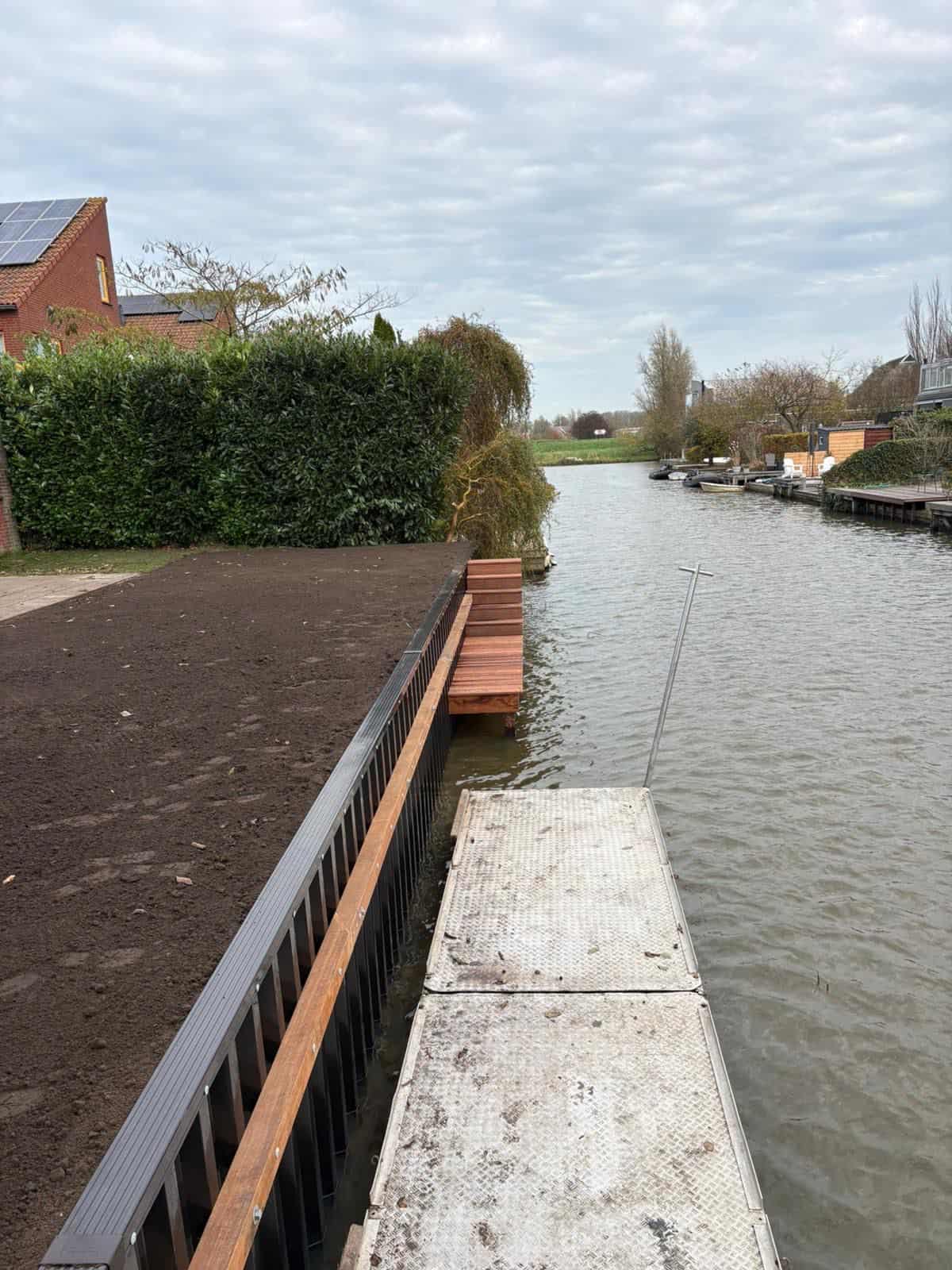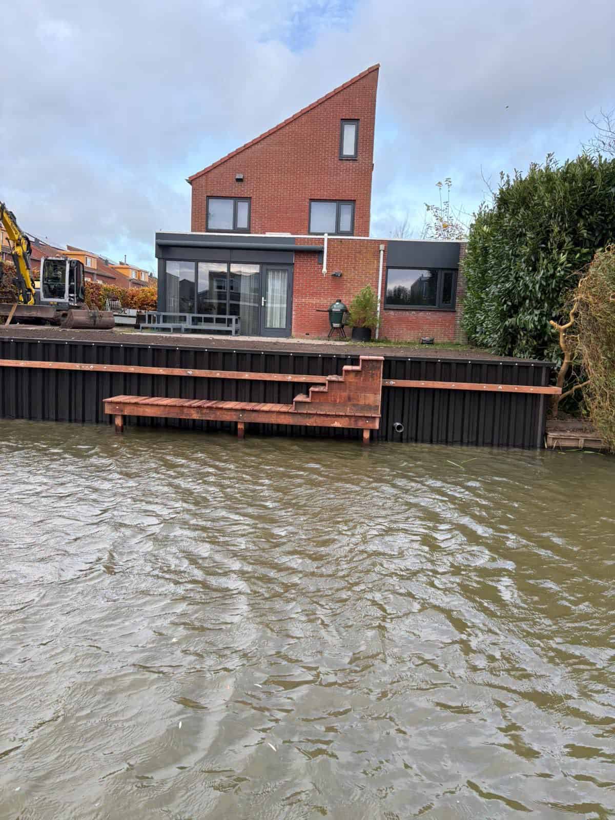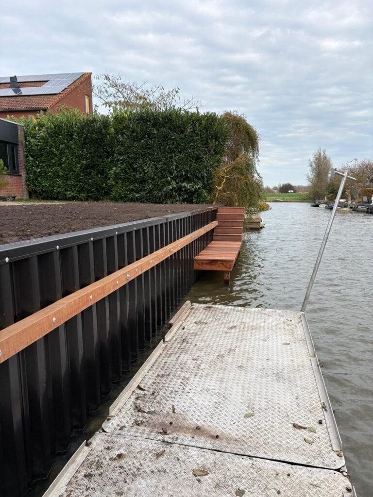 Bij dit project aan de Reitdiephaven is de complete waterkant voorzien van nieuwe kunststof walbeschoeiing. De zwarte elementen creëren een strakke lijn langs het water en geven de tuin direct een opgeruimde en duurzame uitstraling.