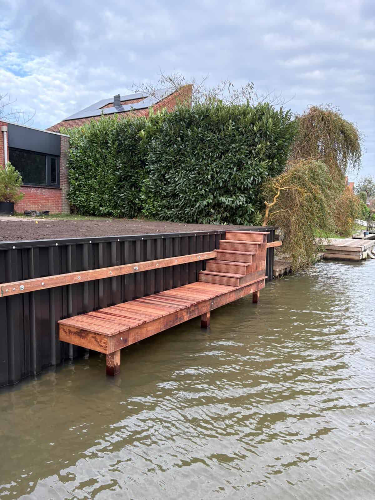 Opvallend detail is het houten trapje en plateautje aan de beschoeiing. Zeer praktisch, om makkelijk bij het water te komen, maar geeft ook een warme, natuurlijke touch aan de strakke constructie.