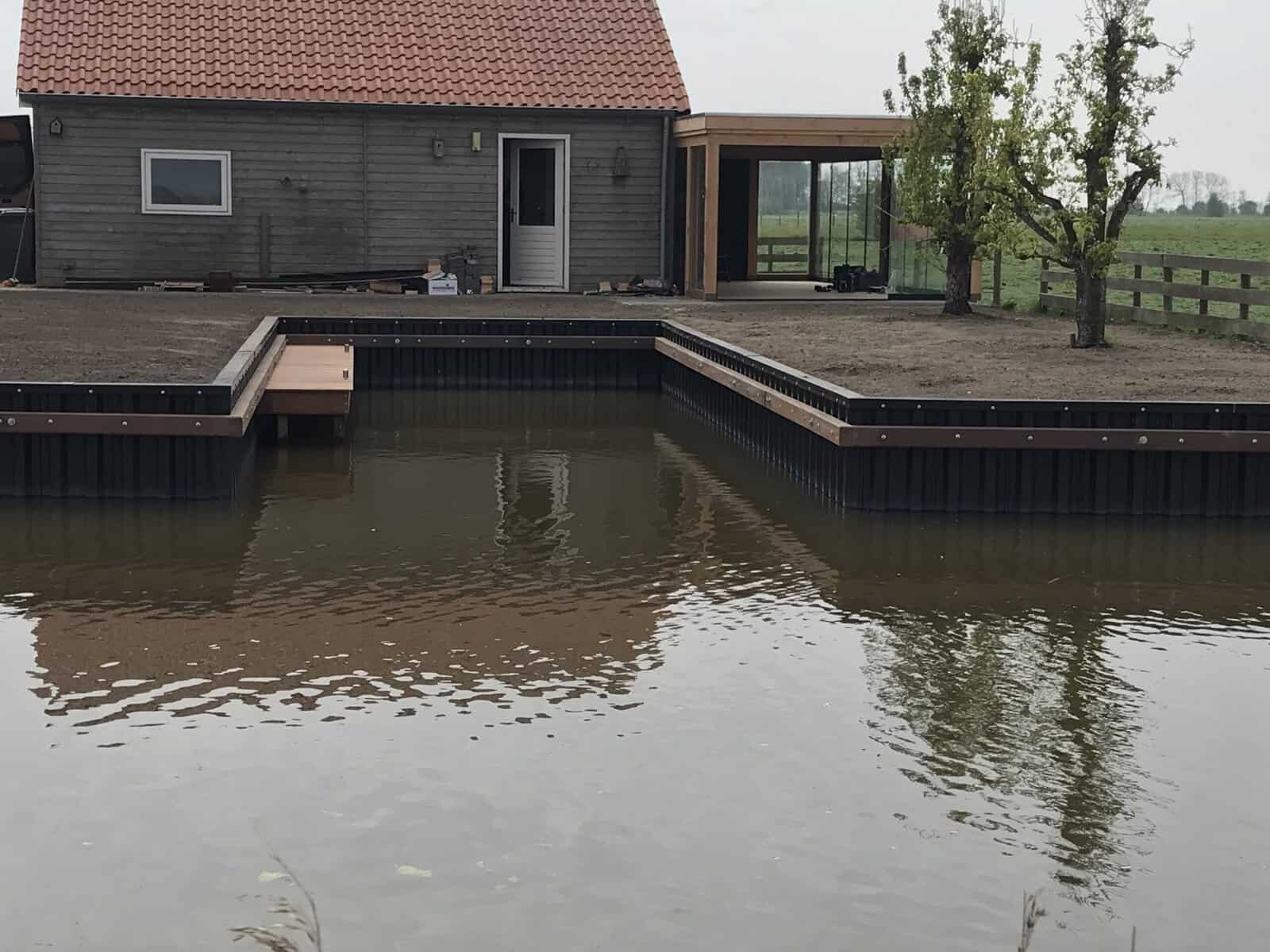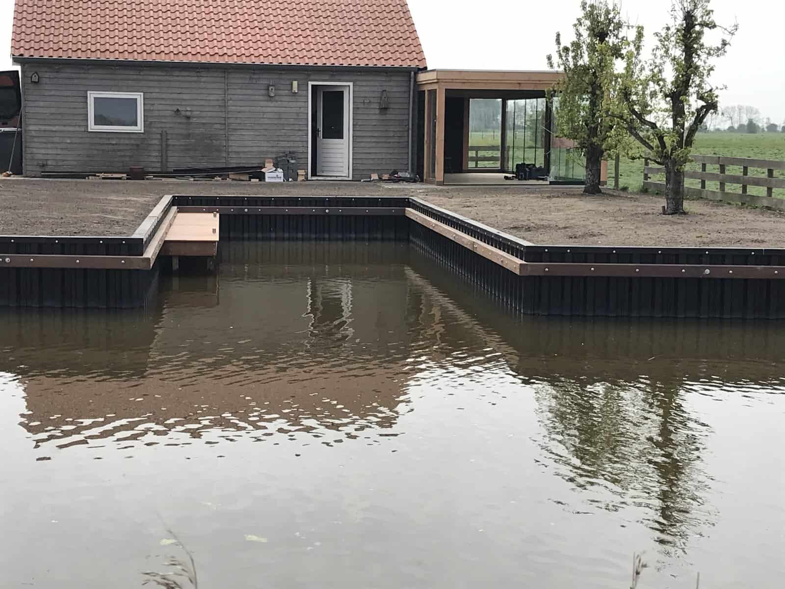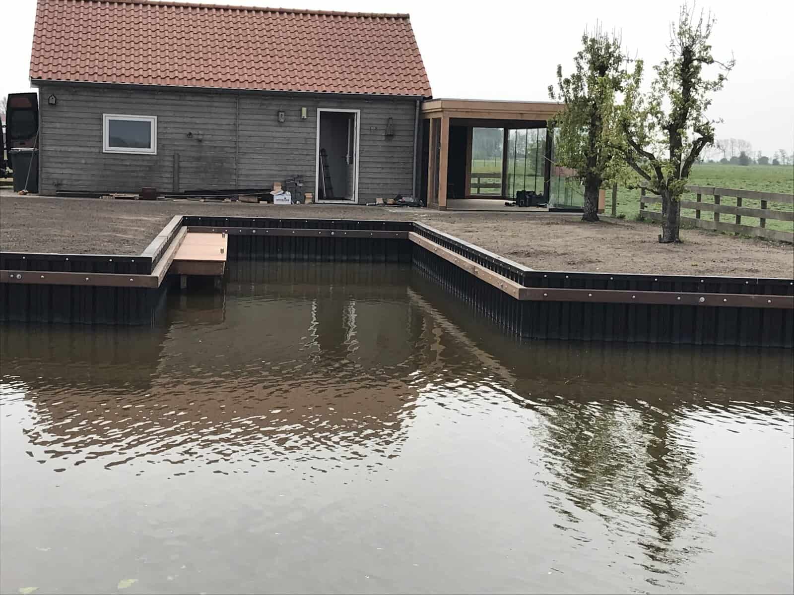 In Skettens is een strakke kunststof walbeschoeiing geplaatst met een geïntegreerd houten vlonderdeel. Deze combinatie zorgt niet alleen voor een duurzame en onderhoudsarme oeverbescherming, maar ook voor een praktische aanlegplek aan het water. Op de achtergrond zorgen de kleurrijke bloemenvelden voor een prachtig contrast met de moderne afwerking van de wal.
