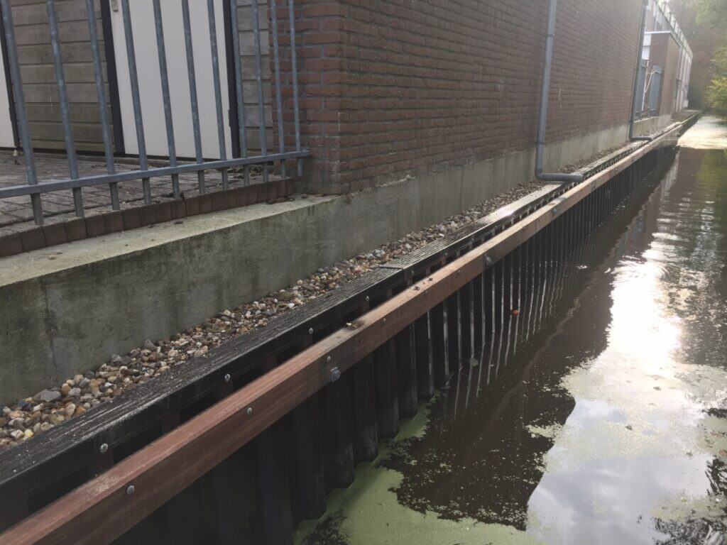 In Sneek hebben wij een duurzame kunststof damwand gerealiseerd. Deze oeverbescherming is volledig vervaardigd uit gerecycled kunststof en vormt een sterk en milieuvriendelijk alternatief voor traditionele beschoeiing van staal of hardhout. De verwachte levensduur bedraagt minimaal 50 jaar, omdat de palen van de constructie niet in contact komen met zuurstof.