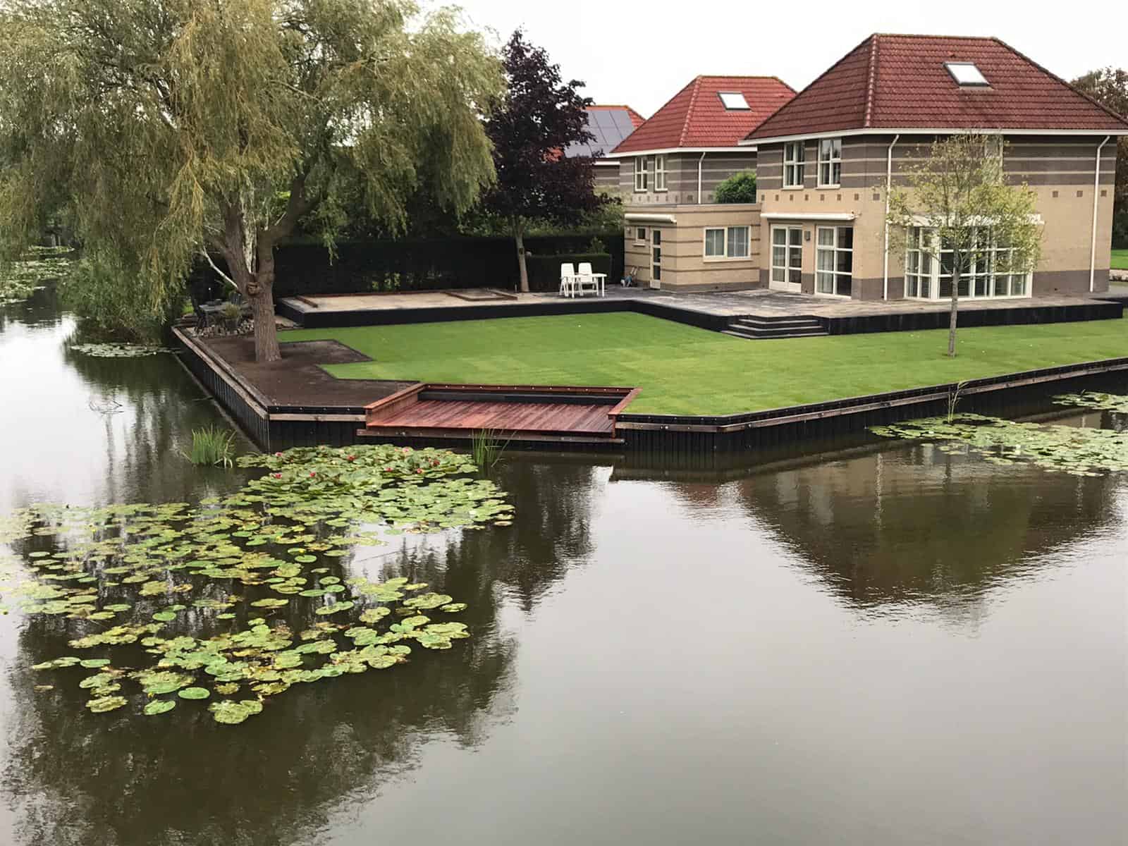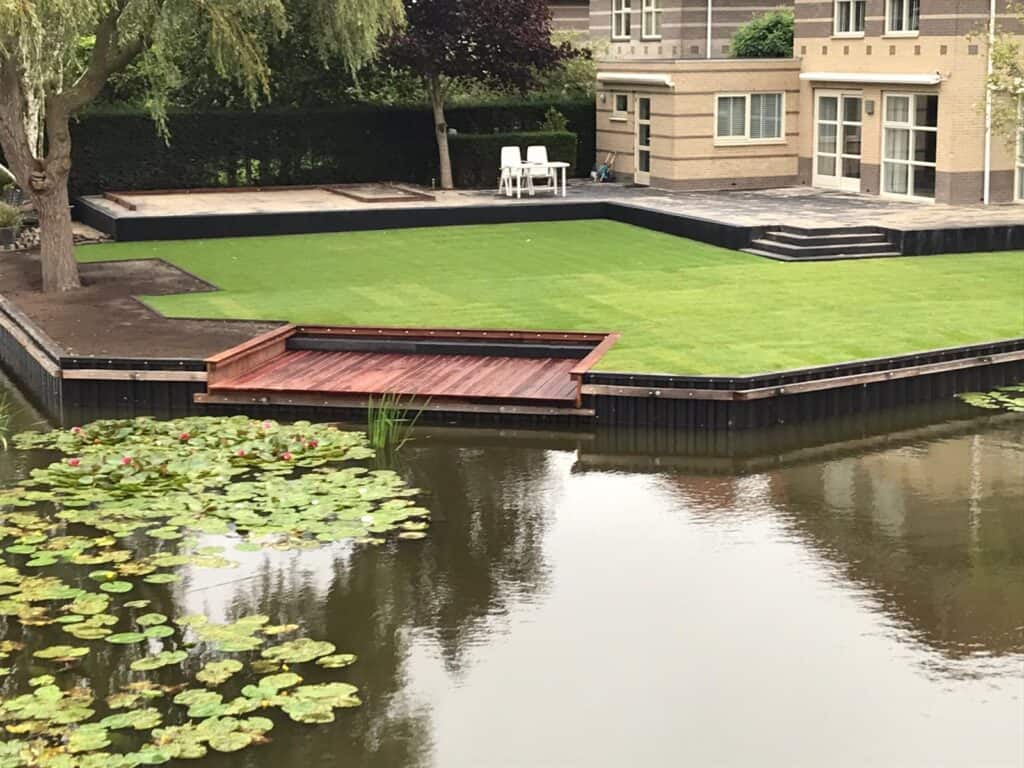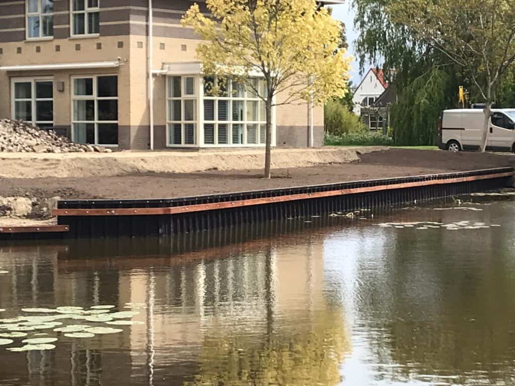 Ook hebben wij een hardhouten vlonder en aanlegplek aangebracht, zodat de bewoners eenvoudig hun boot kunnen aanmeren. Kunststof walbeschoeiing gaat minimaal 50 jaar mee en vraagt nauwelijks onderhoud, waardoor dit een toekomstbestendige oplossing is.