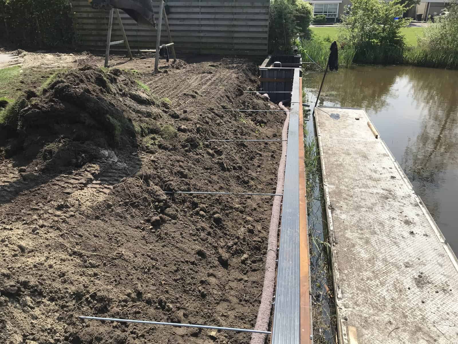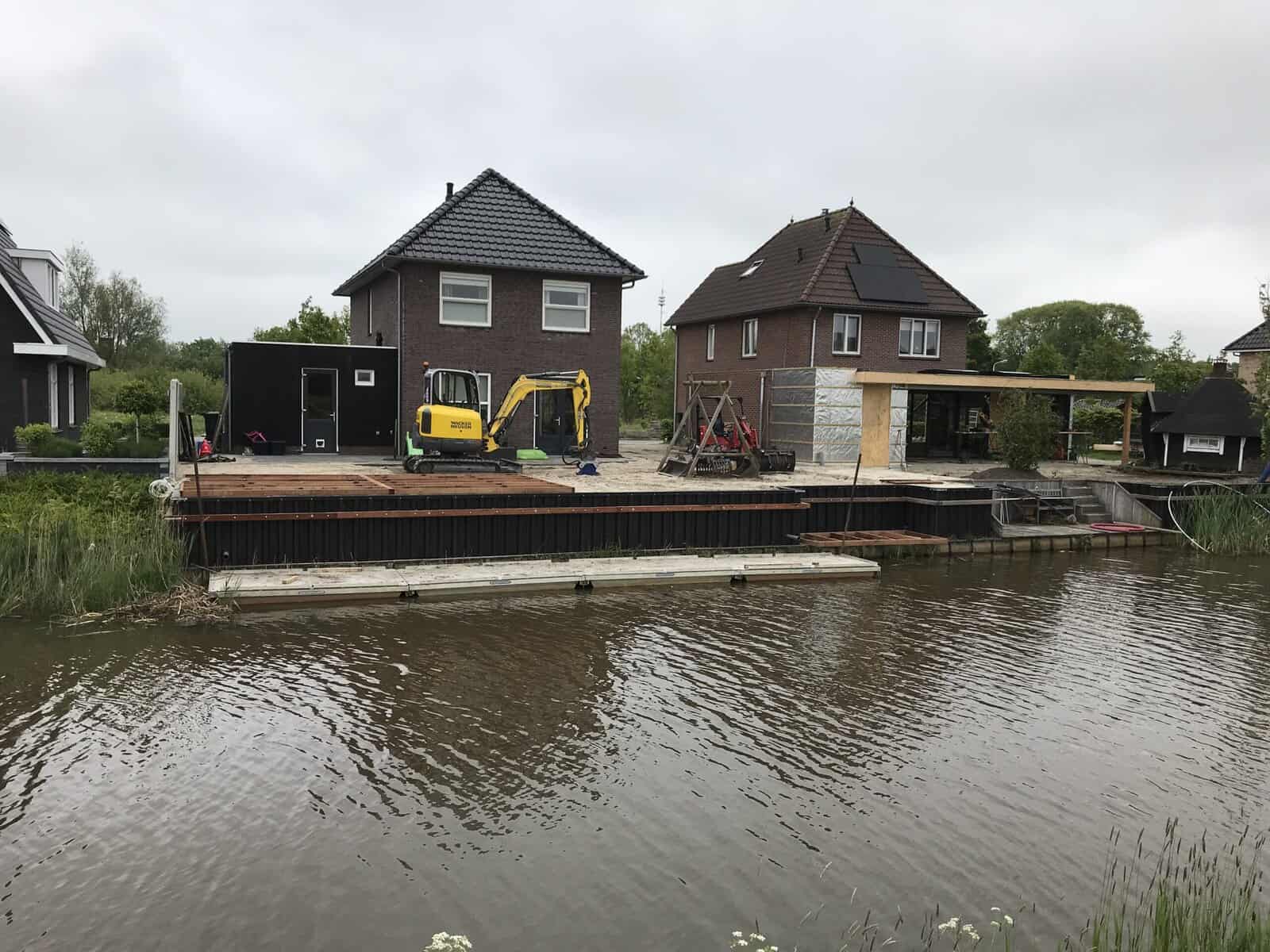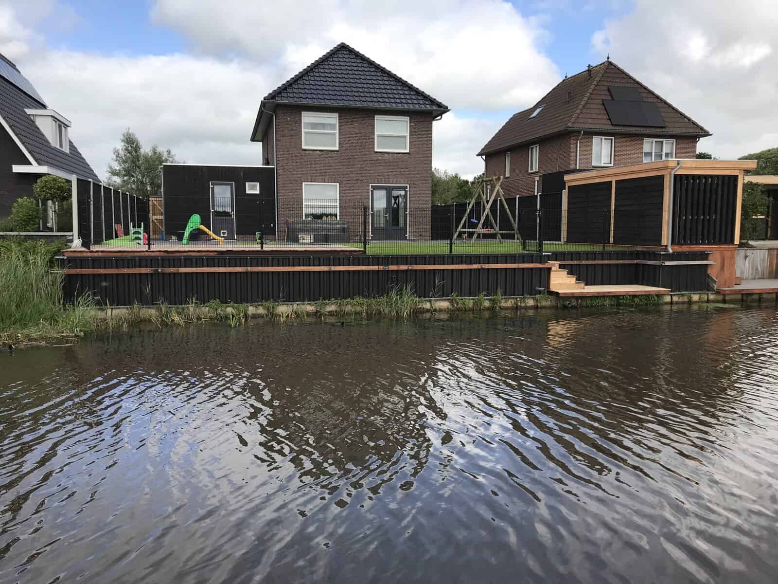In Drachten hebben we de complete tuinaanleg en de walbeschoeiing verzorgd bij een klant. Er is gekozen voor een hoge kunststof walbeschoeiing, zodat de tuin tot aan de waterkant gebruikt kan worden. Om toch contact met het water te houden, hebben we een hardhouten vlonder geplaatst. Ideaal om een boot aan te leggen of gewoon te genieten van de natuur aan het water.