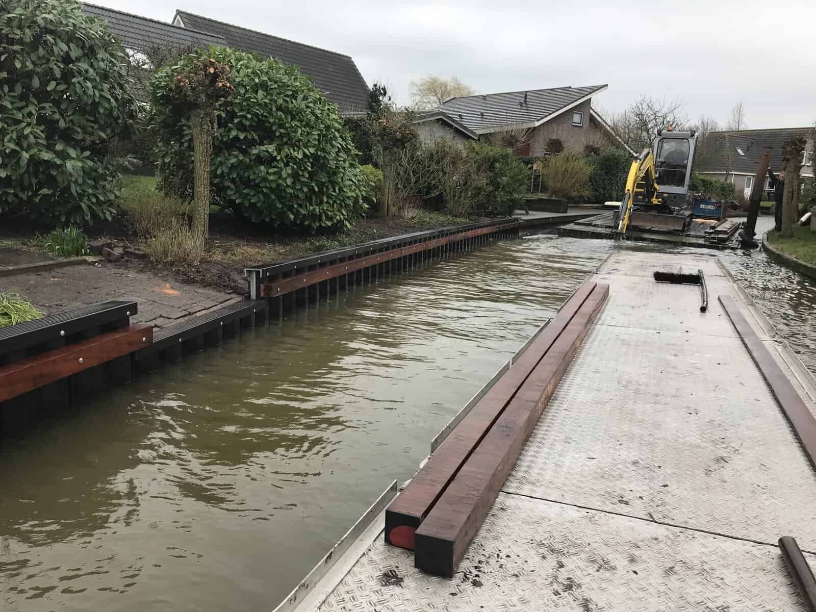 In Sneek hebben we kunststof walbeschoeiing met een hardhouten gording geplaatst langs de waterkant. De lage kunststof walbeschoeiing zorgt dat je goed contact houdt met het water. Op de plek waar de beschoeiing is onderbroken, kan de klant makkelijk de boot aanleggen.