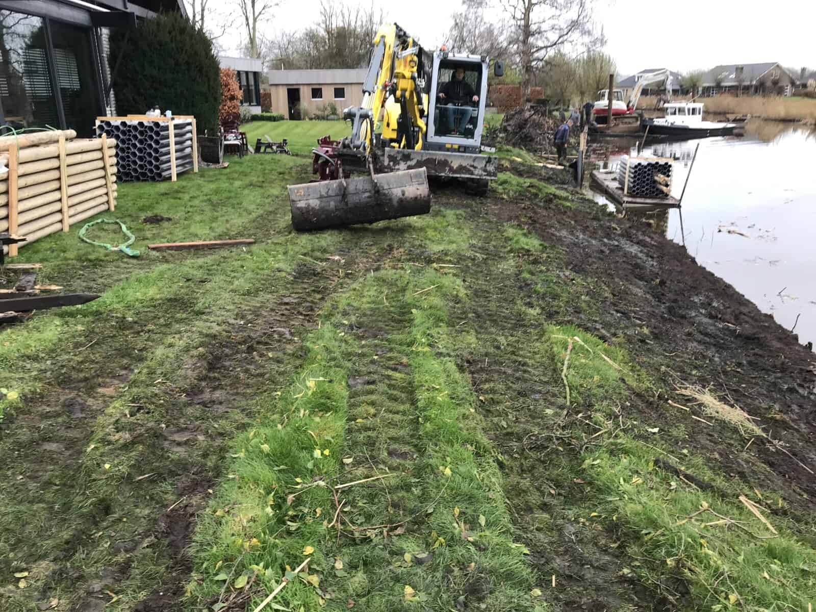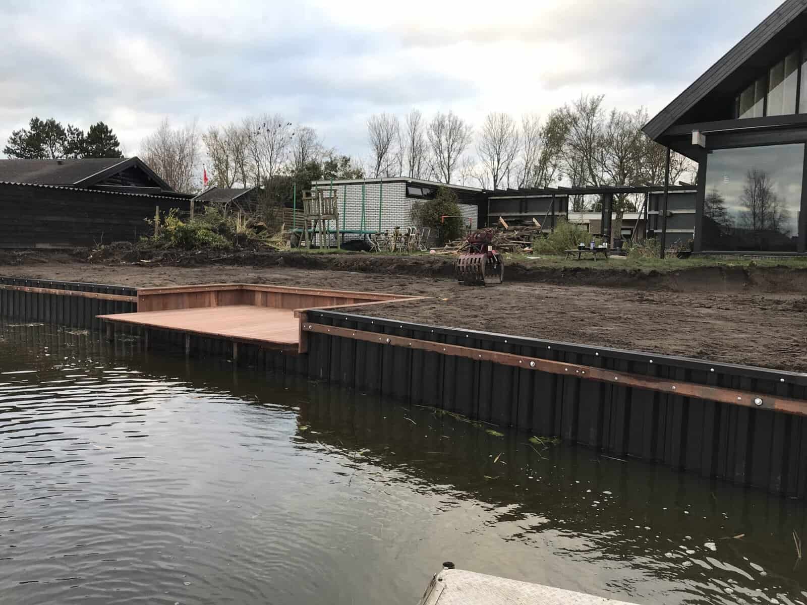 In Winsum hebben we bij een riante villa nieuwe walbeschoeiing geplaatst. De ene klant kiest voor hardhout, de ander voor een strakke, duurzame kunststof walbeschoeiing. Hier is gekozen voor kunststof, en om het geheel te breken en meer contact met het water te houden, hebben we er een hardhouten vlonder bij geplaatst.